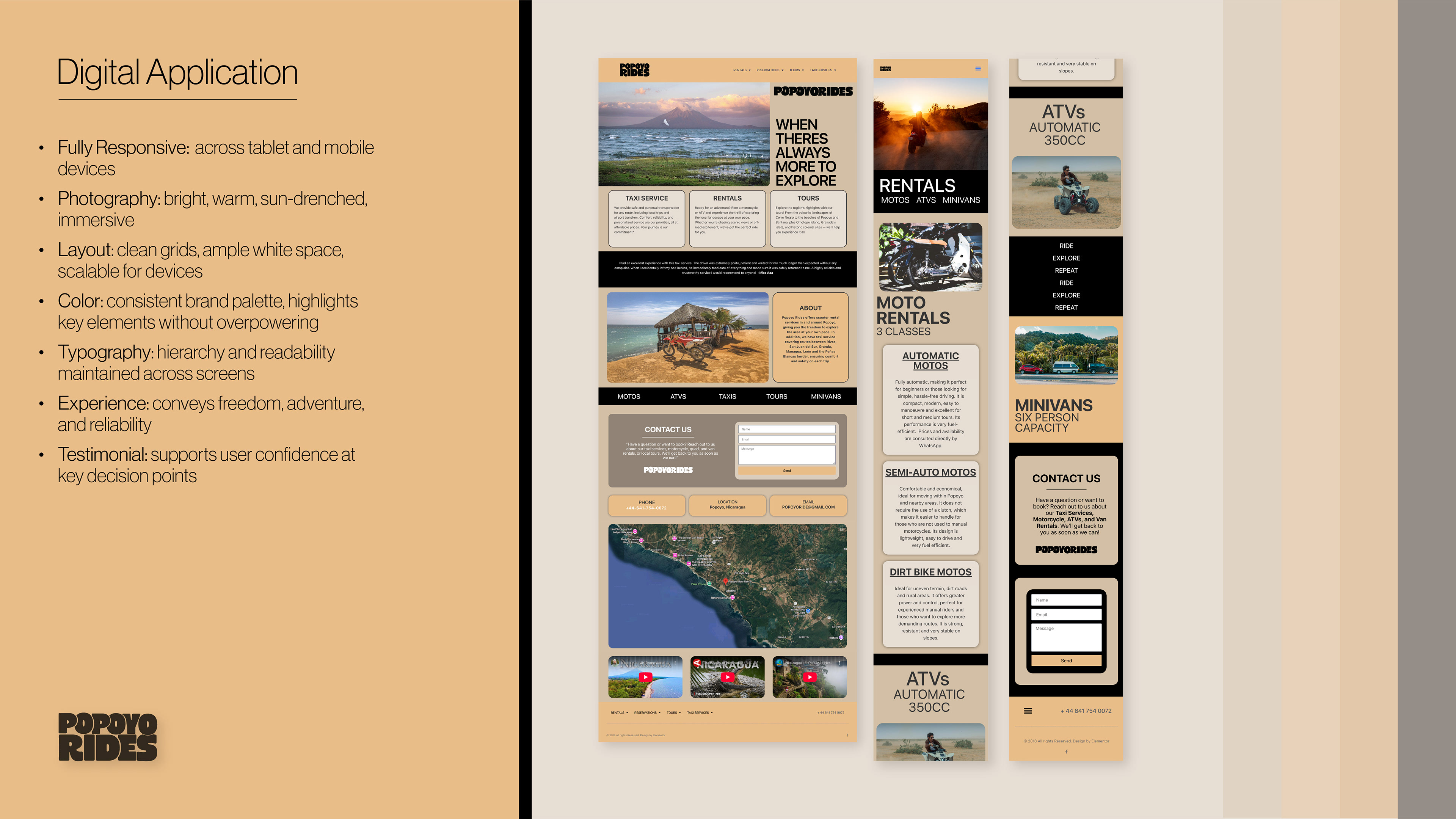 Developed for a small business in Nicaragua offering transportation and tours, this project embodies the warmth of the region’s culture and environment. Additionally, it conveys adventure and a sense of security, giving clients the confidence to book with ease.